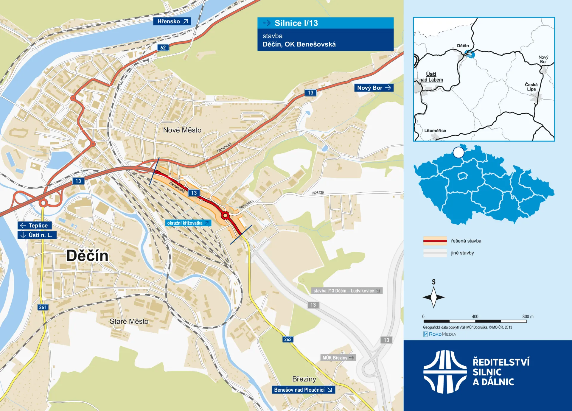 Krajský úřad Ústeckého kraje (konkrétně jeho odbor územního plánování a stavebního řádu) zahájil v únoru řízení k povolení záměru „I/13 Děčín – OK Benešovská“. Řízení se týká 27 stavebních objektů, které zahrnují např. přeložku silnice II/262, napojení ulice Liberecká, Folknářská, Příkrá a Lipová či napojení cementárny a teplárny a průmyslových areálů z ulice Liberecká. Žádost se týká i plánované protihlukové stěny délky 68 m. Stěžejním objektem záměru je výstavba nové okružní křižovatky , a to v místě křížení Benešovské a Folknářské ulice. Okružní křižovatka je navržena s jednopruhovými vjezdy a výjezdy a jednopruhovým okružním pásem.